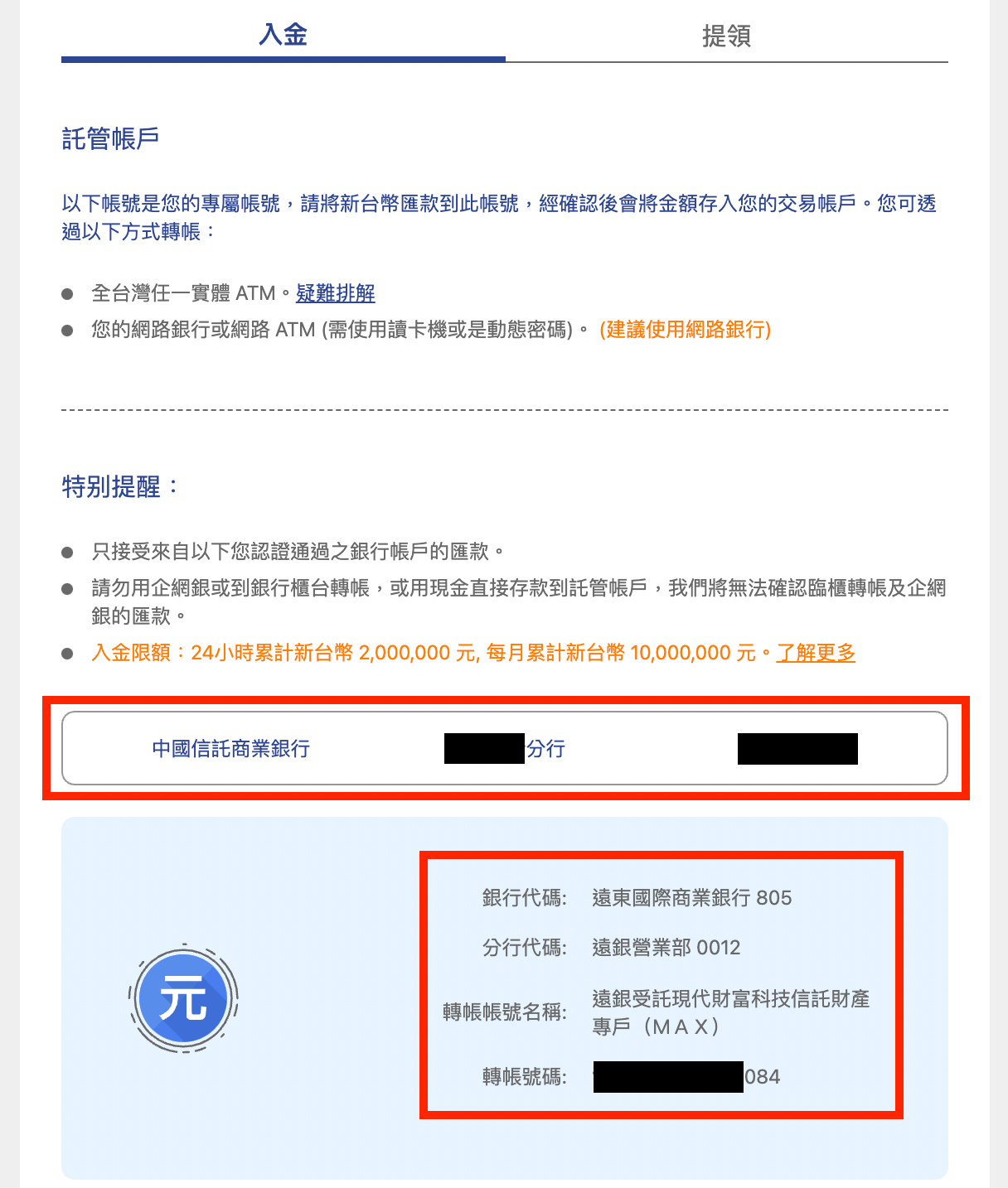 第一個是上面紅色框框,會顯示註冊時我們綁定的帳號,一定要用這個帳號來進行匯款。第二個是下面紅色框框,會顯示你專屬的入金匯款帳號。