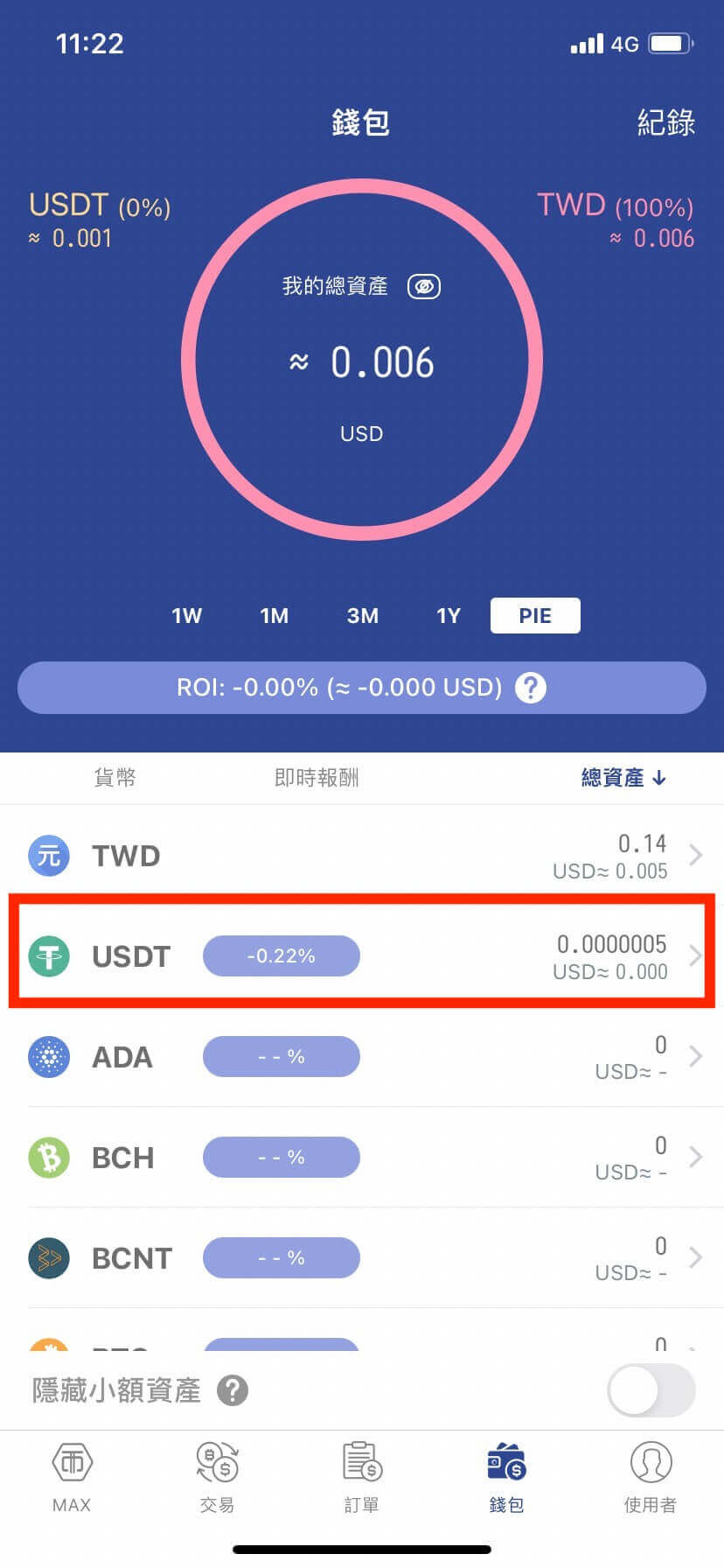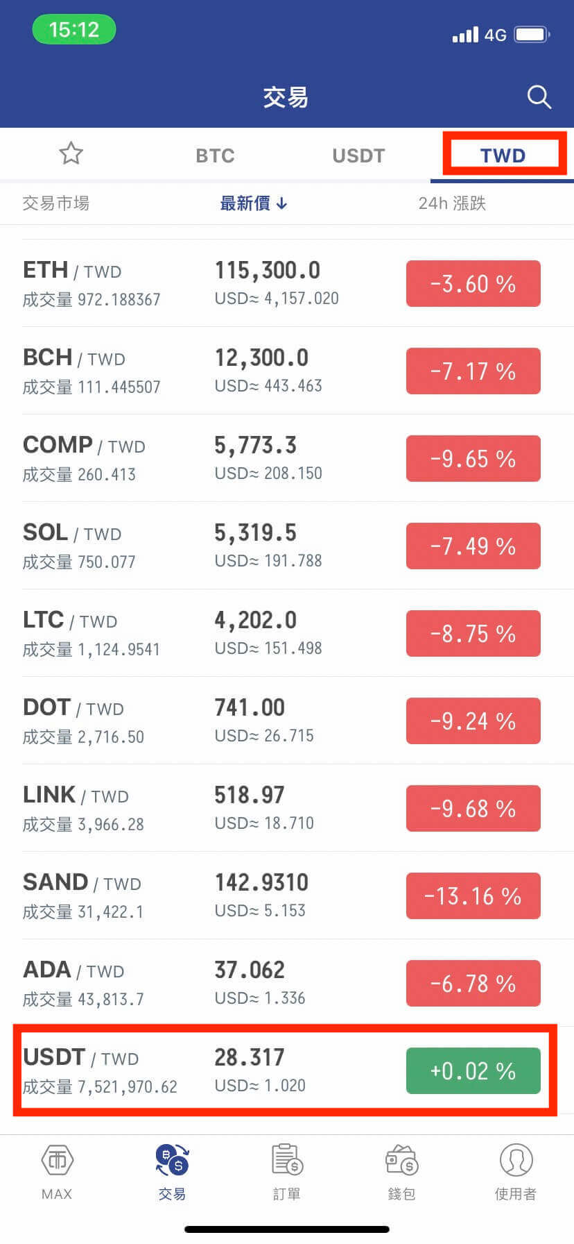 1、登入MAX>點選TWD(台幣)>找到USDT